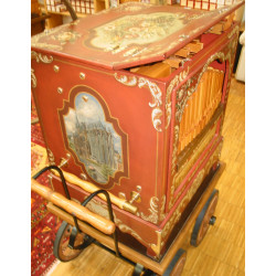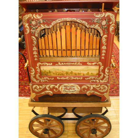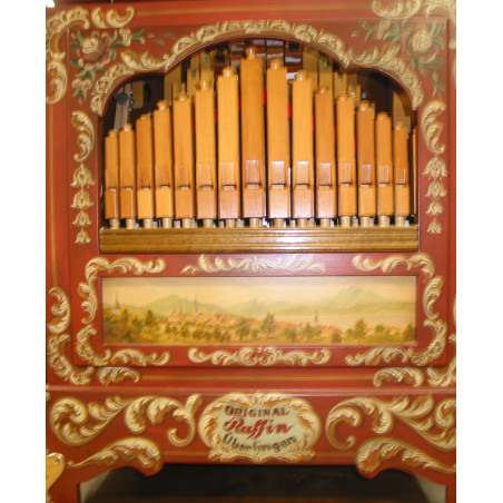 Original Raffin Konzertorgel R 31/103 mit 31 Tonstufen und 103 Pfeifen - 5 schaltbare Register inklusiv Trompeten - Fb. altrot - Sonderbemalung durch unsere Kunstmalerin mit 2 seitlich aufgemalten Motiven - Blasebalg wurde überprüft und funktioniert einwandfrei, schöner voller, kräftiger Pfeifenklang. Orgel wurde von uns gereinigt, gestimmt, Ventile reguliert.